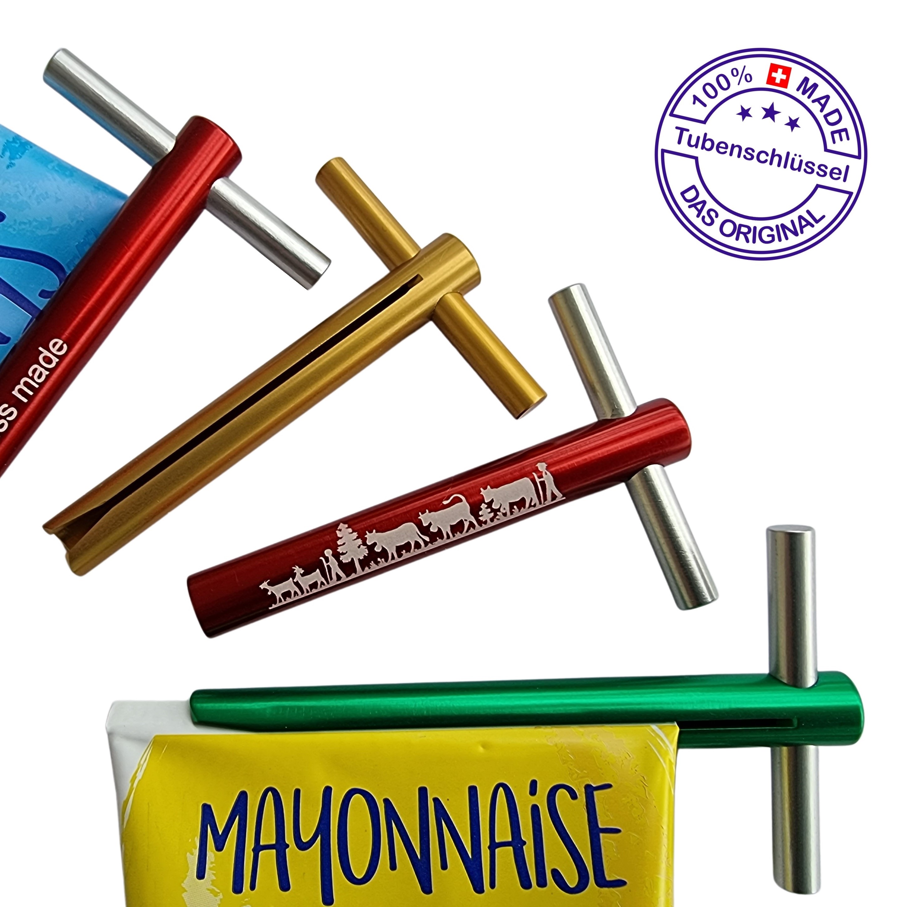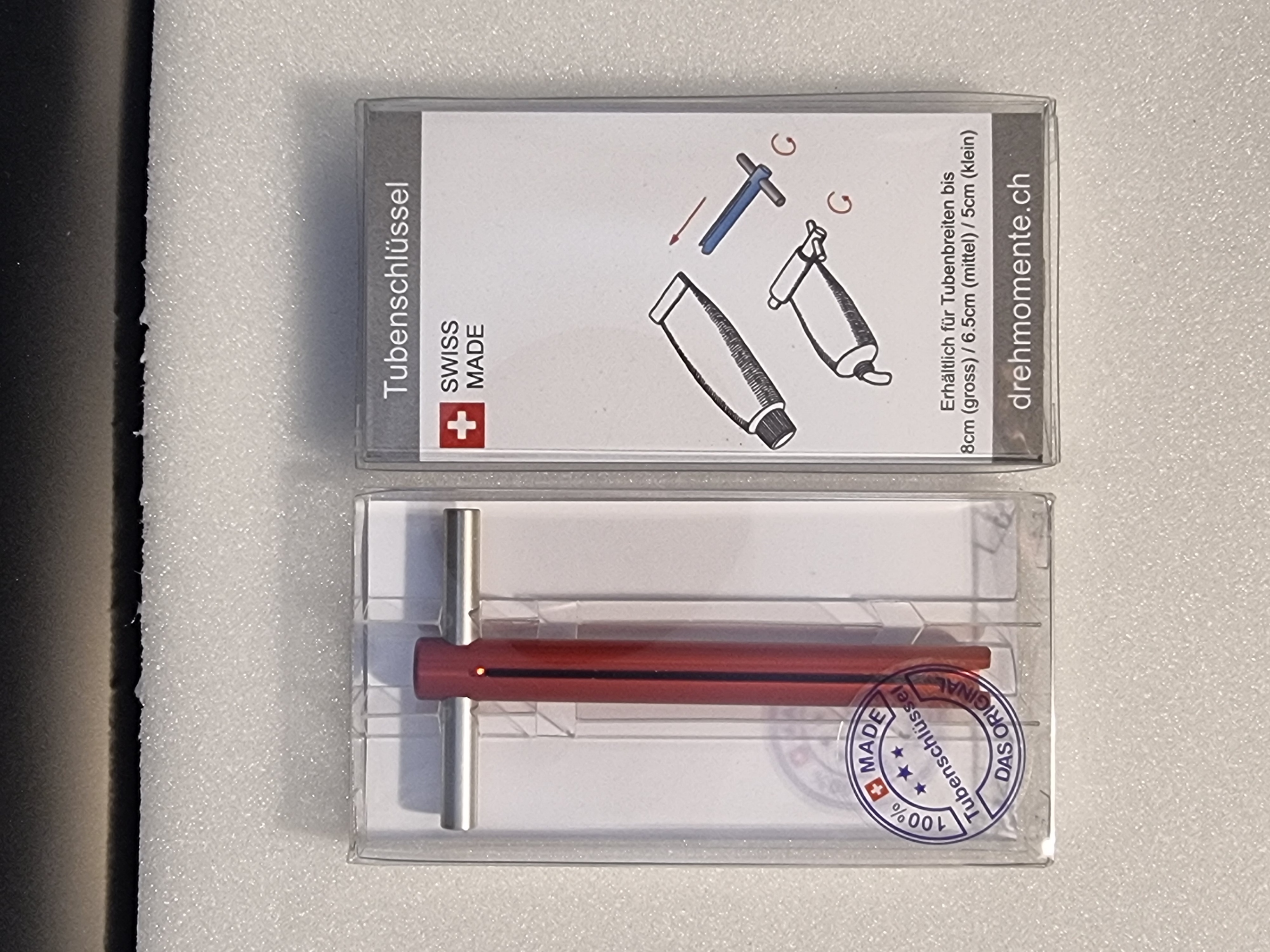 Der Original Schweizer Tubenschlüssel aus farbig eloxiertem Alu.
